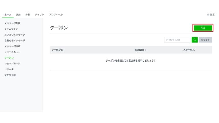 まずはLINE公式アカウントにログインをし、上記画像のクーポンから作成のボタンをクリックします。