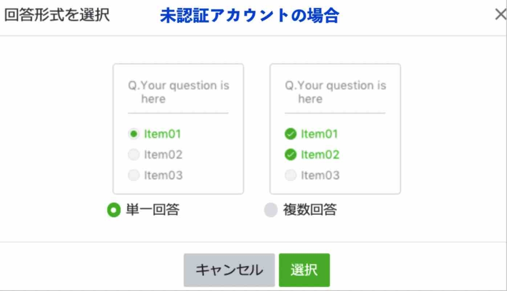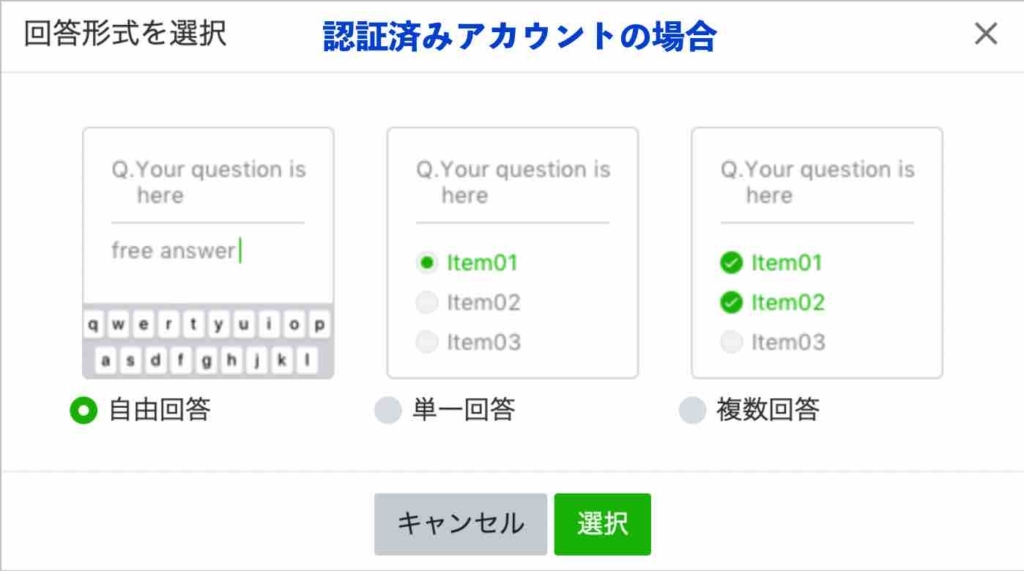 「未認証アカウント」では、ユーザーへのアンケートは、単一回答と複数回答の選択肢しかありませんでしたが、「認証済アカウント」では、単一回答と複数回答に加えて、自由記述も選択肢にあります。