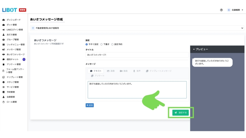 - 今すぐ設定:「あいさつメッセージ」の内容が「設定する」を押下したタイミングで反映される