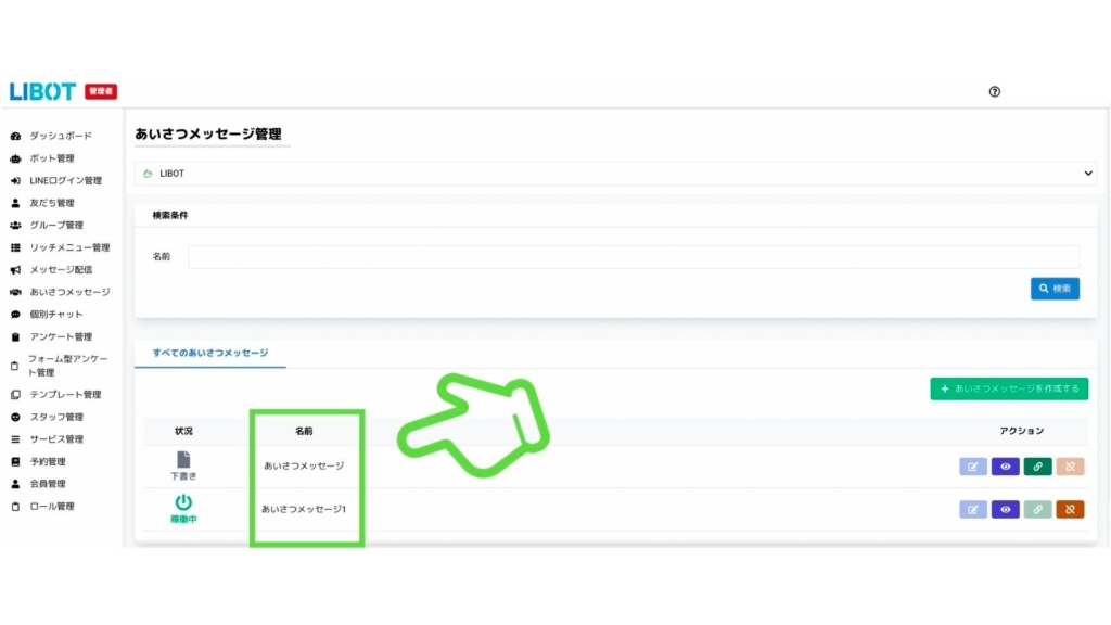 「あいさつメッセージ管理ページ」に遷移した後は、あいさつメッセージを作成する(上記の画像右側の黄緑色の枠)を選択します。