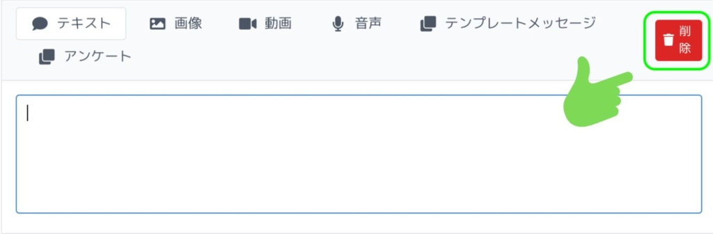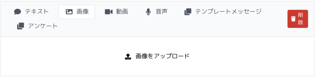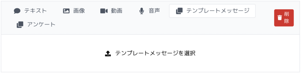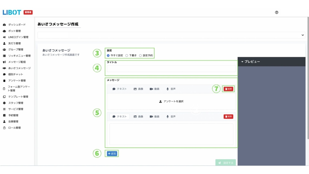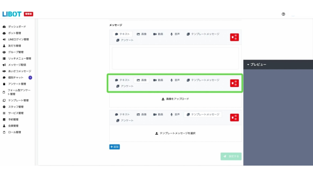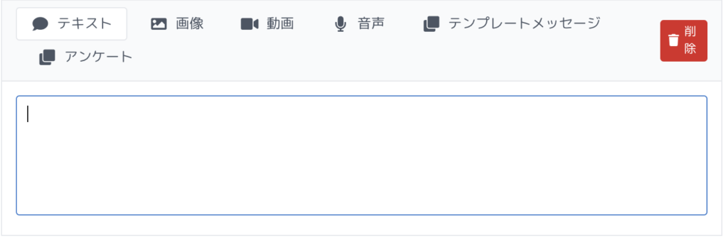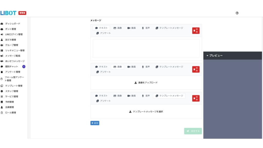 メッセージを設定するエリアです。テキスト、画像、動画、音声、LIBOT内で作成したアンケートやテンプレートメッセージを設定することが可能です。