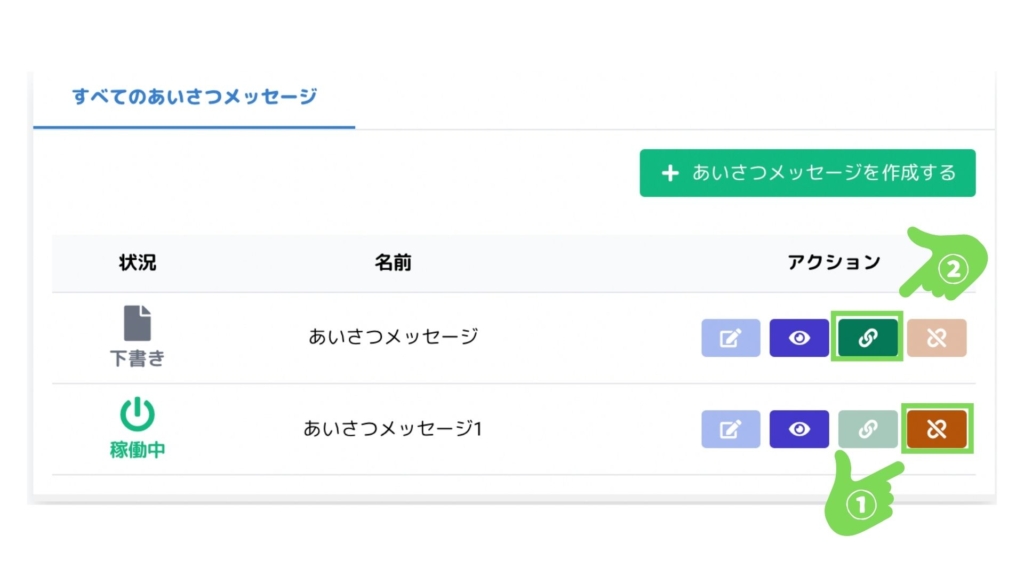 - 稼働中となっているあいさつメッセージを停止させる(下の画像の①をクリック)