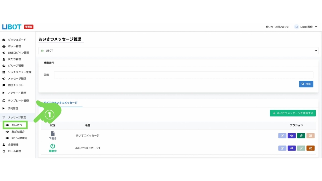 LIBOTにログインし、サイドバーの「あいさつ」をクリック。