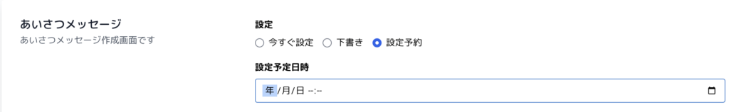 - 設定予約:日時指定をし、指定のタイミングから「あいさつメッセージ」の内容が反映される