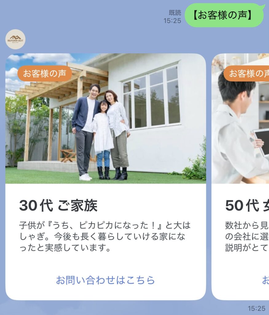 カード型メッセージ:複数の情報をカルーセル形式でまとめて届けられるため、比較や検討を促しやすい配信形式です。