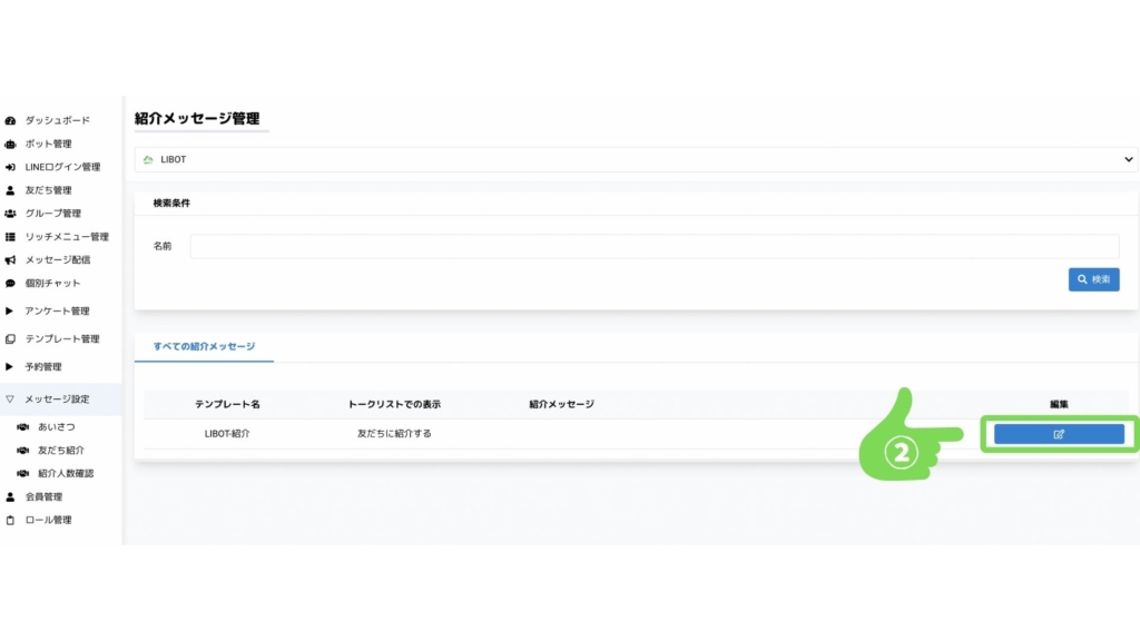 ②紹介メッセージ管理ページで「編集」を選択