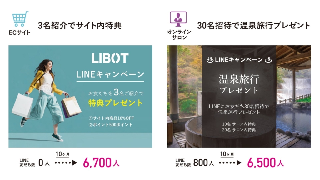 「紹介特典」をモチベーションに行われる「友だち紹介」をさらに活発にさせるために、破格の特典を設定することで、短期間で急激な友だち増加が期待できます。
