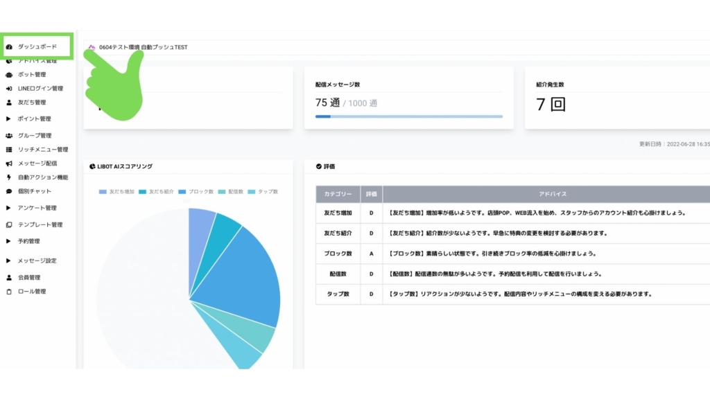 AIスコアリングは、ダッシュボードの友だち数の下に位置します。ですので、LIBOT管理画面のサイドバーダッシュボードを選択することで表示することが可能です。
