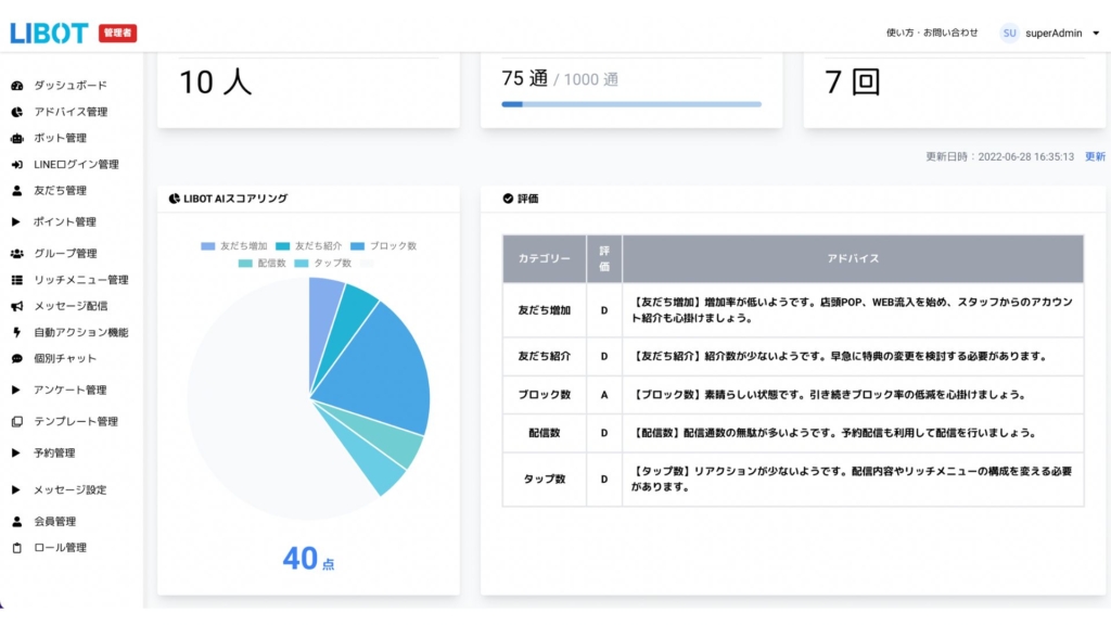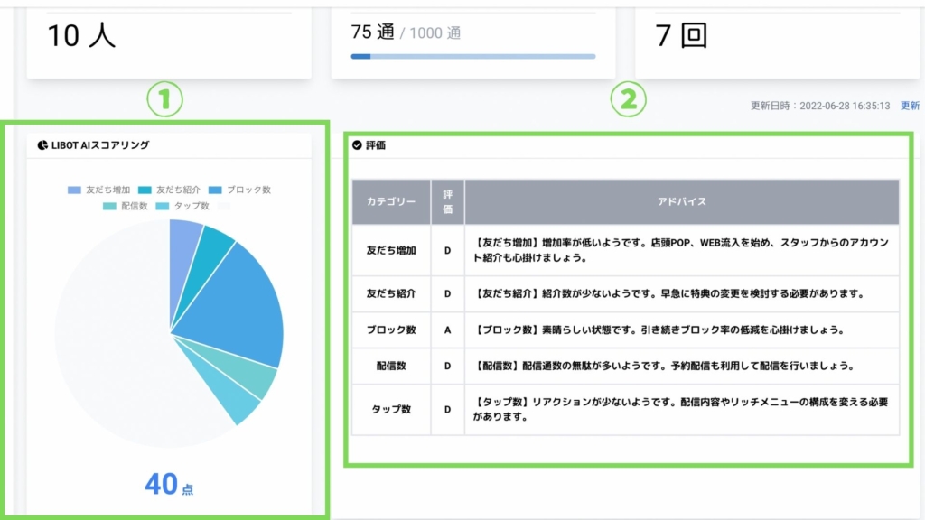LIBOTのAIスコアリングは、LINE公式アカウントの運用状況を「友だち増加」「友だち紹介」「ブロック率」「配信数」「タップ数」の5つの観点から評価し、スコア化する機能です。 これにより、運用の強みや課題を可視化し、改善のためのアドバイスを提供します。