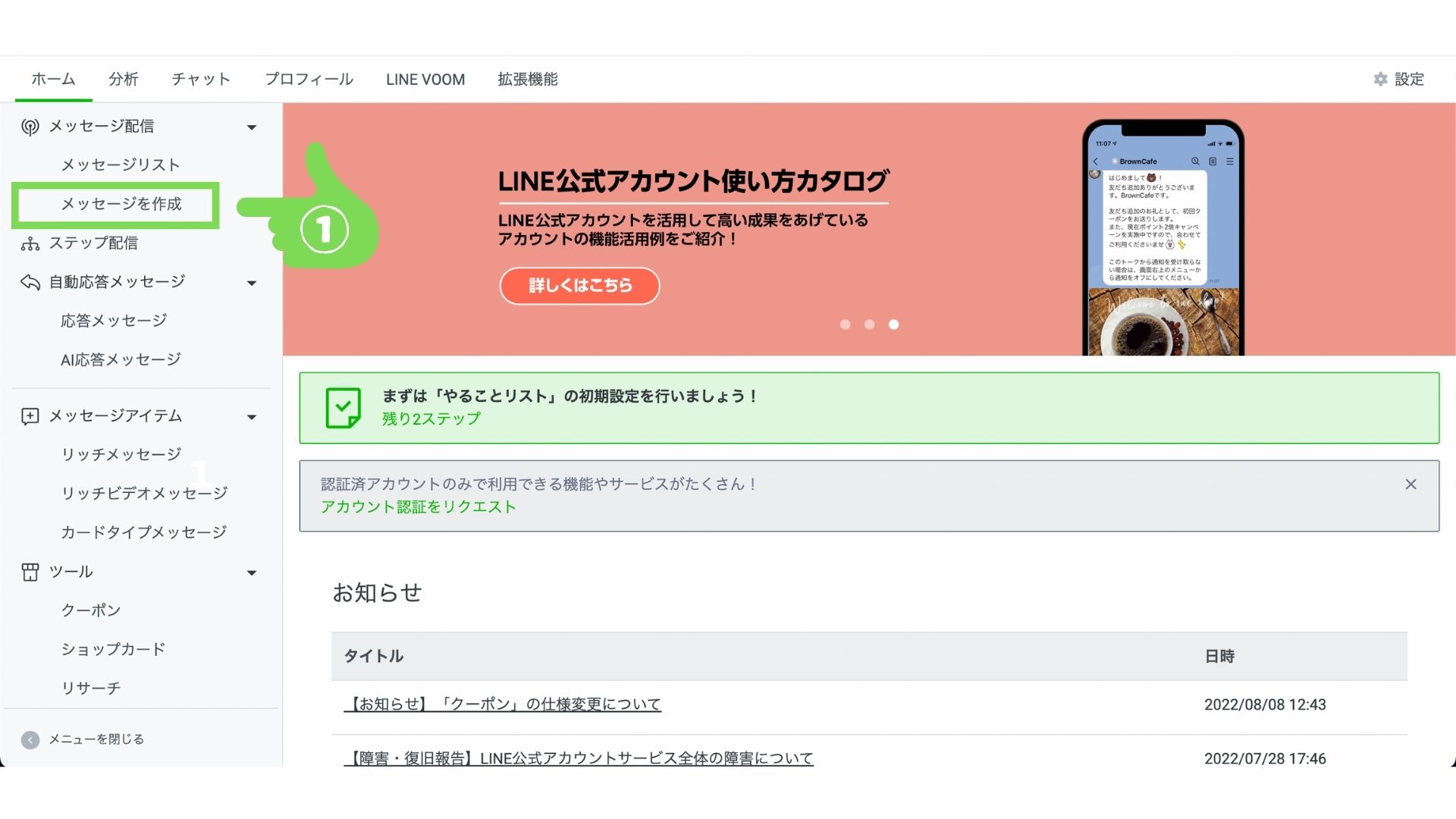 LINE Official Account Managerにログインし、「メッセージを作成」をクリックする(下記画像)