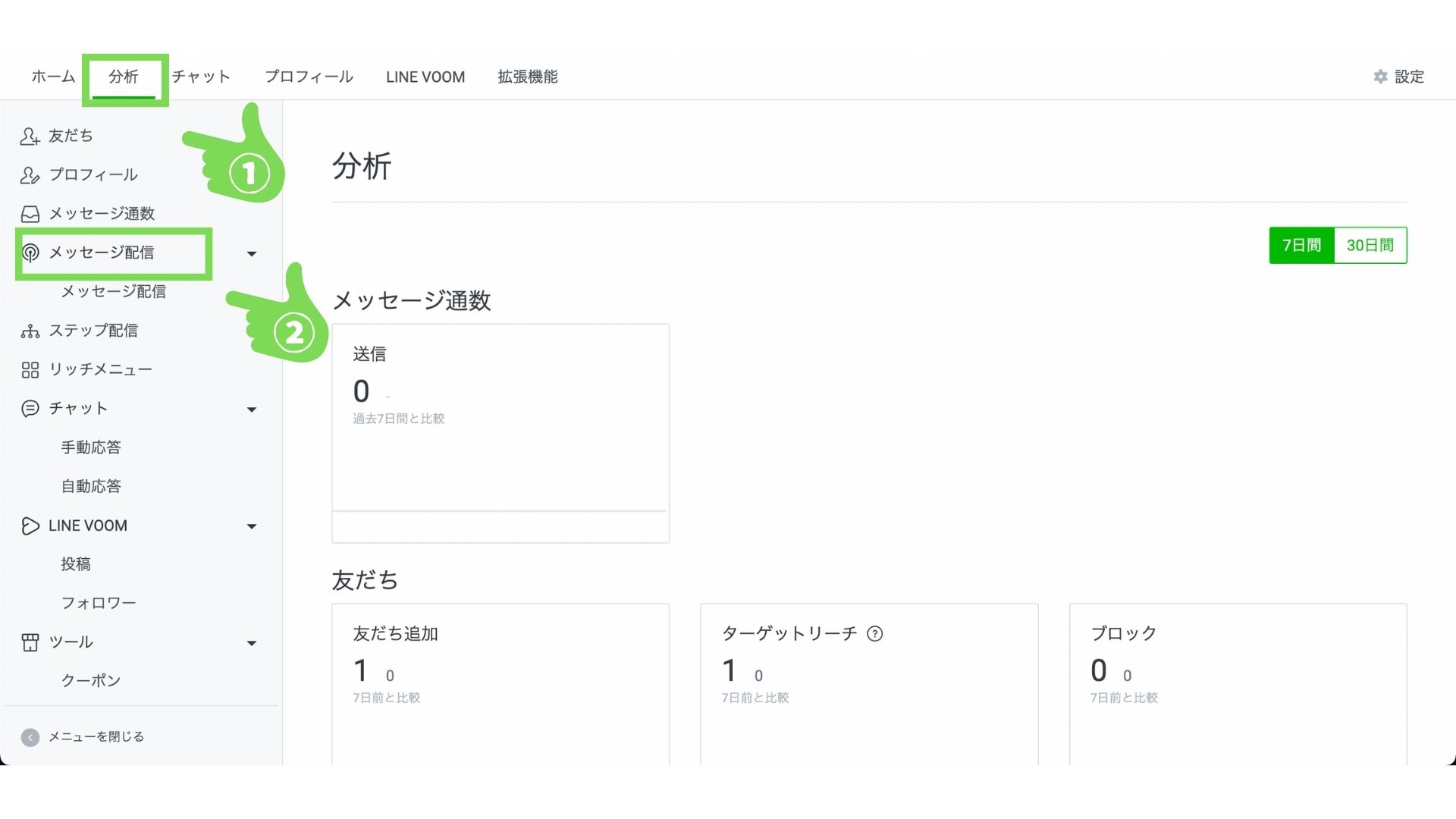 分析をクリックし、サイドバーのメッセージ配信を選択します。
