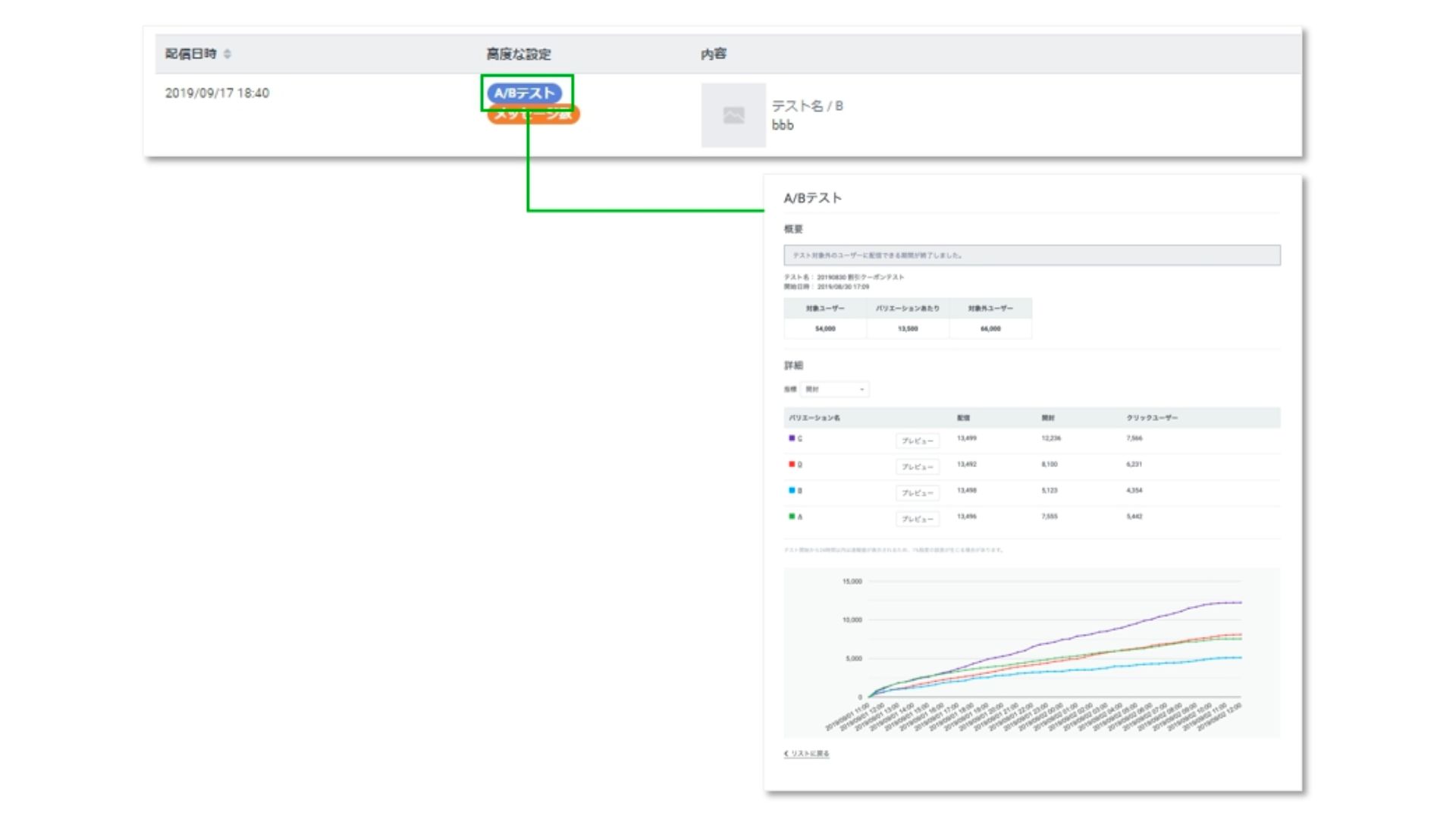 A/Bテストメッセージを配信するだけでなく、分析のページのメッセージ配信から、結果を図や表で見ることが可能です。そのため、手間をかけることなく、分析をすることが可能になります。