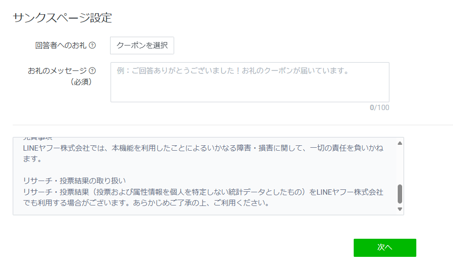 回答者にお礼として、クーポンを渡したい場合はここでクーポンを選択しておきましょう。すると、アンケートの回答後にユーザーへクーポンを手渡すことができます。