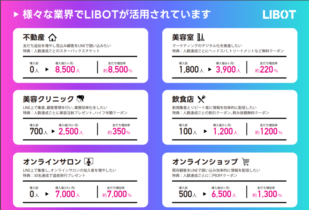 LIBOTが特に効果を発揮している飲食、美容、不動産の各業界に分けて、具体的な事例を紹介します!