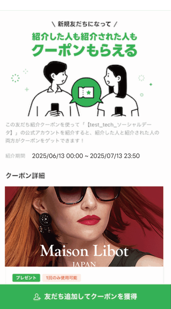 友だち紹介クーポンを紹介されたユーザーは、「友だち追加してクーポンを獲得」ボタンを押すことでクーポンを獲得することができます。