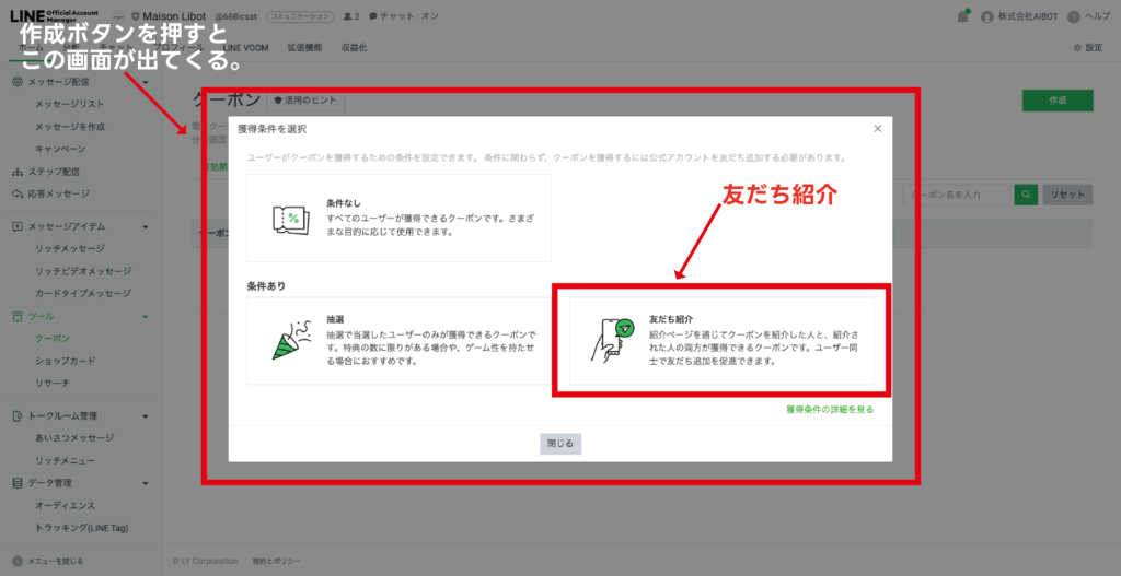 作成ボタンを押したら、獲得条件の「友だち紹介」をクリックします。