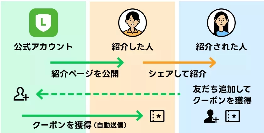 新規友だちを追加することで紹介者と被紹介者がクーポンや特典を受け取る仕組みです。
