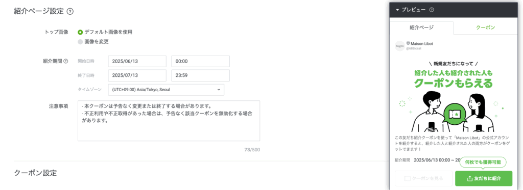 次に、「友だち紹介クーポン」を設定します。