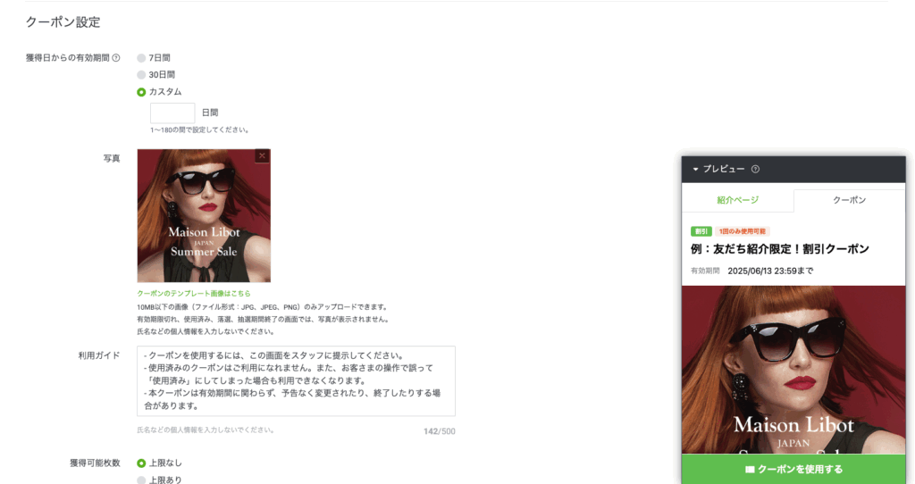・クーポンの画像(こちらも画像サイズに制限あり。テンプレート利用可能。)