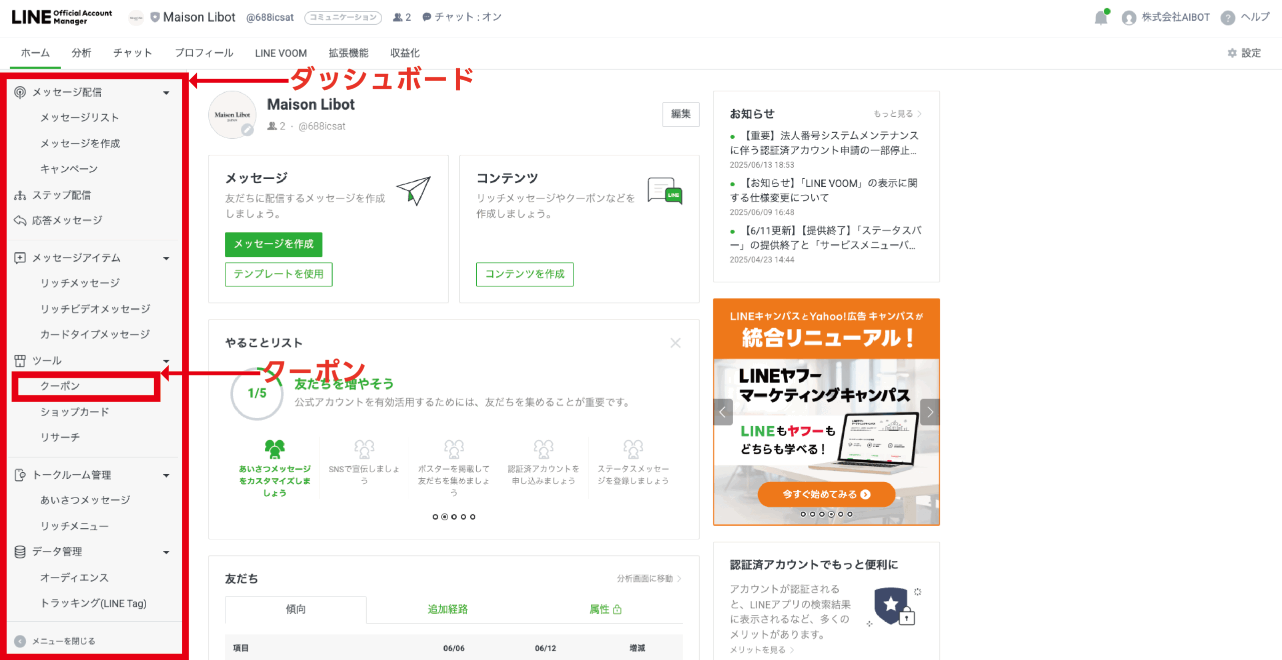 無料の場合、LINE公式アカウントの管理画面(LINE Official Account Manager )から紹介クーポンを使うことで行うことができます。