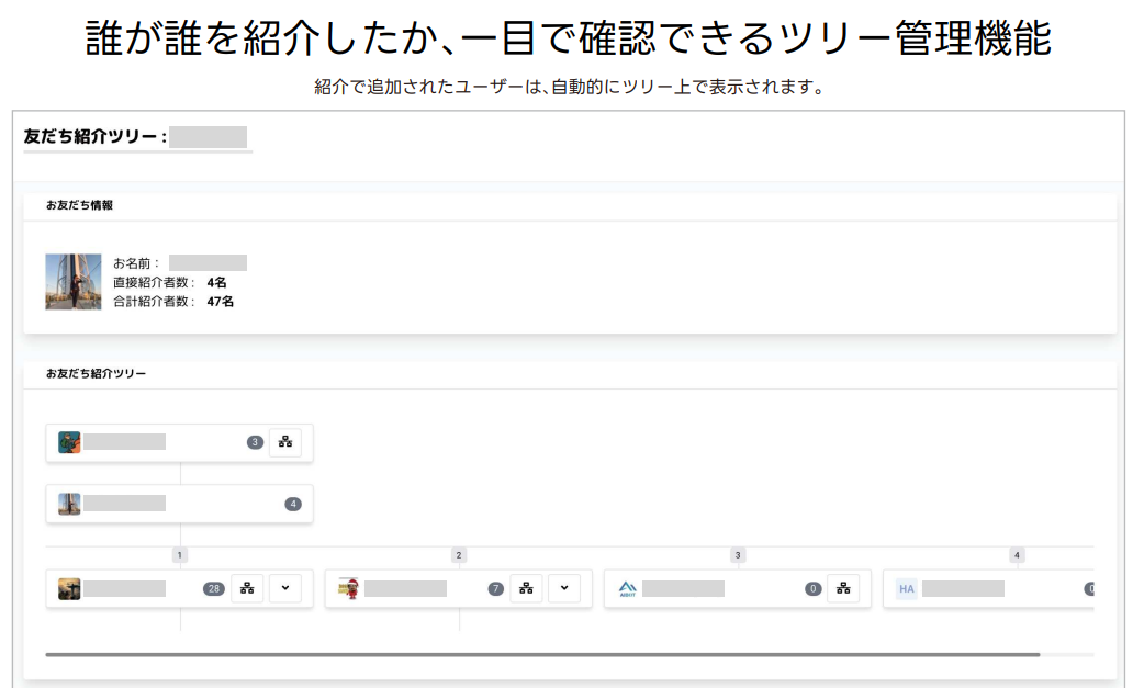 “誰が誰を紹介したのか”が自動でツリー構造で可視化されます。
