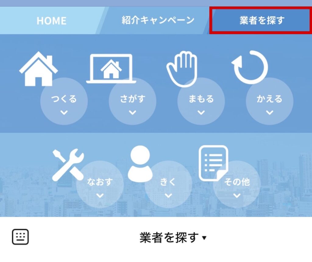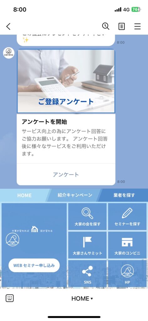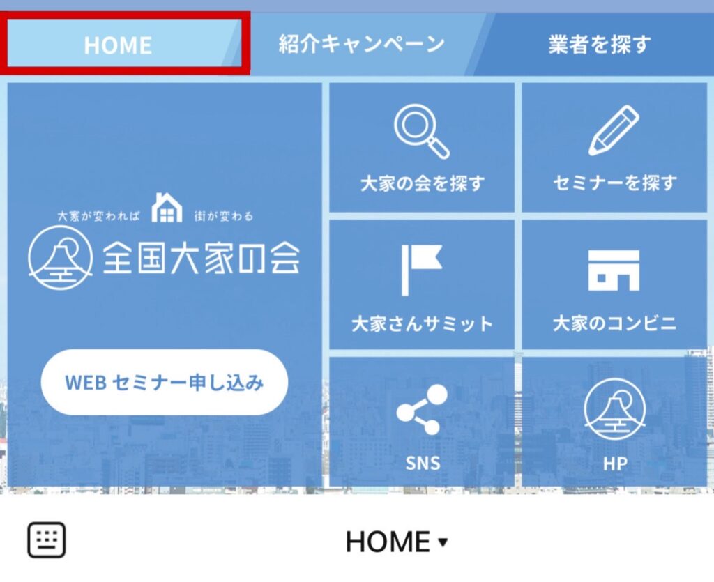 先程ご紹介したZ社様もリッチメニュー切り替え機能を利用しており、「HOME」「紹介キャンペーン」「業者を探す」という3つに使い分けています。