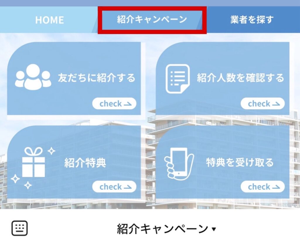 Z社様のリッチメニューは、「HOME」「紹介キャンペーン」「業者を探す」の3つのタブに分かれており、