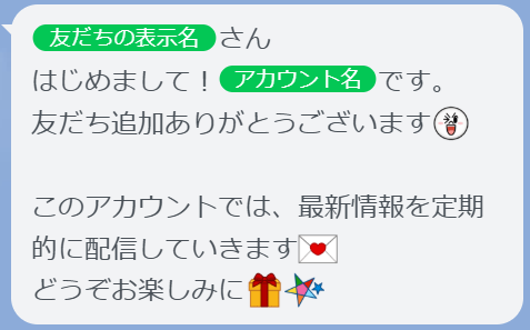 クリックすると、メッセージの「{AccountName}」の箇所にアカウント名が差し込まれます。「アカウント名」をメッセージに含めると、その時点のアカウント名を可変的にメッセージに含めることが可能です。