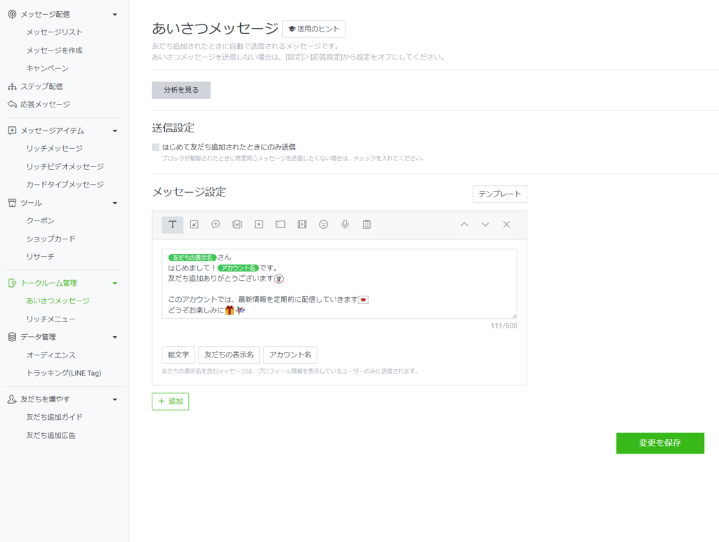 「このテンプレートを追加」「すべて削除してこのテンプレートを追加」をクリックすると、あいさつメッセージにテンプレートが設定されます。設定後、内容の編集が可能です。