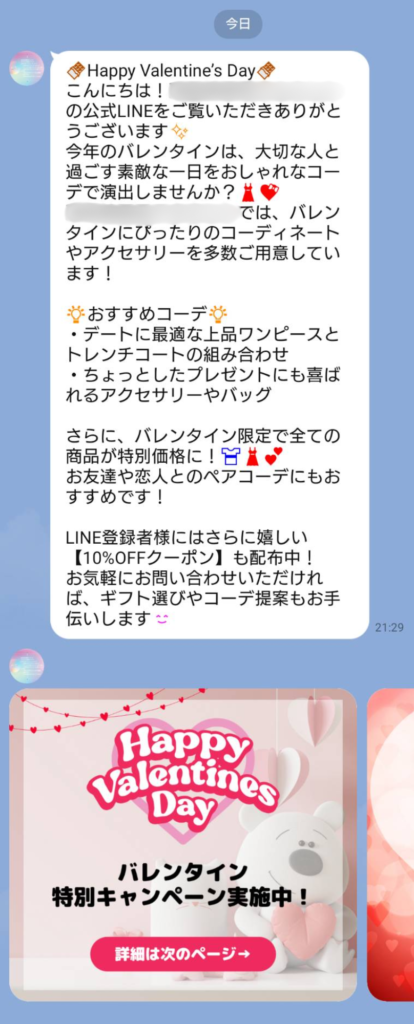 ここでのポイントは、ユーザーに「自分のための特別な内容」という印象や「限定的の情報」を与えることで、次の行動に進みやすくなります。配信相手の名前入れることでの特別感やクーポンなどで得をするというイメージを持ってもらいましょう。