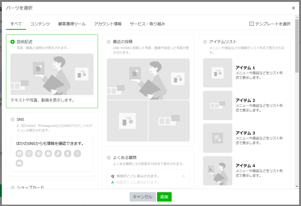 • 自由記述(写真/動画+説明文)、アイテムリスト、最近の投稿、ショップカード、クーポン、お知らせ、SNSリンク、よくある質問(最大10件)、感染症対策、デリバリー/出前/テイクアウト情報など、豊富なコンテンツを追加できます。