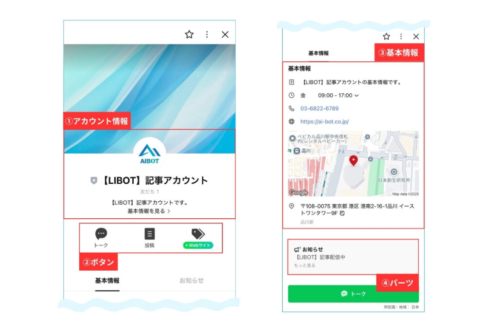 • 紹介文、営業時間、予算、電話(LINEコールまたは電話番号)、Webサイトリンク、予約ページリンク、支払い方法、設備情報(席数・個室・Wi-Fi等)、住所と地図表示などが設定可能です。ai-bot.co.jp