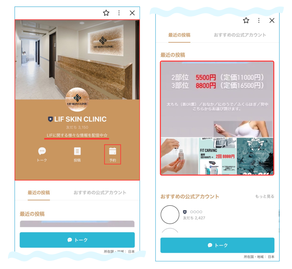 そして、先ほどの火鍋のアカウントと同様にLIF SKIN CLINICでも、「最近の投稿」が活用されています。