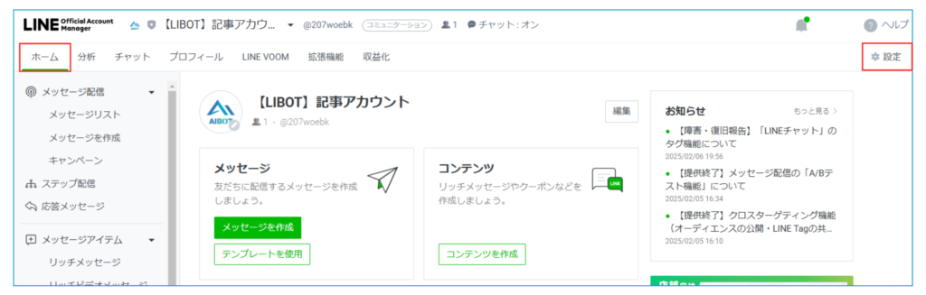 まずは、LINE Official Account Managerにログインし、画面右上の「設定」をクリックします。