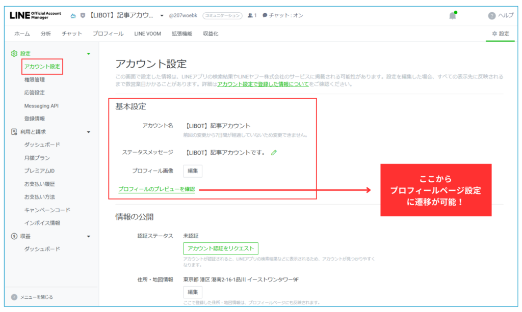 LINE Official Account Managerのアカウント設定メニューで設定した情報を確認することができます。