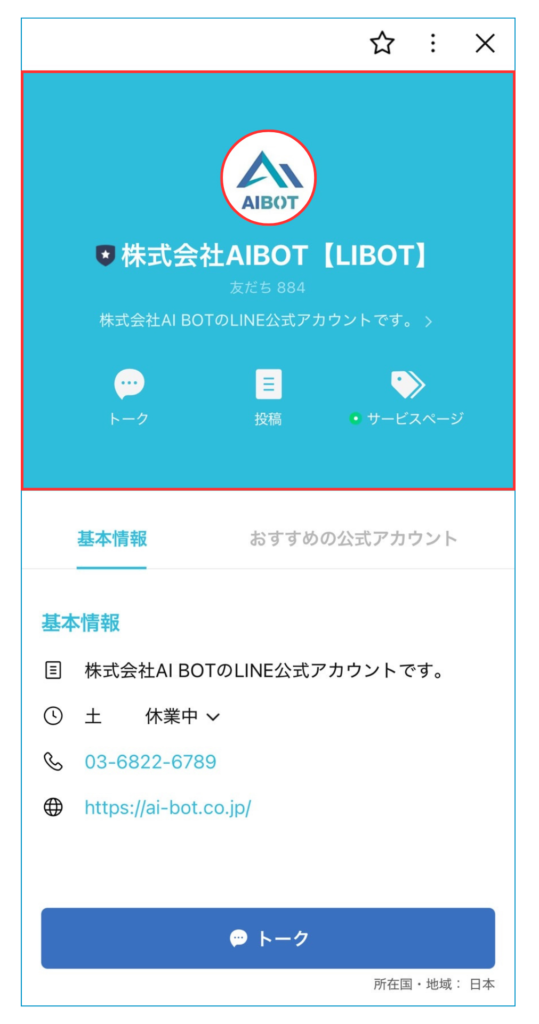 例として、株式会社AIBOTの公式LINEのプロフィールでは、ブランドカラーである青色で統一しています。