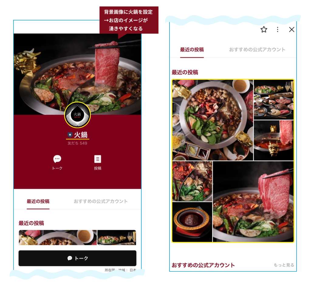 火鍋のプロフィールでは、背景画像に火鍋の画像を設定しており、どんなお店なのかがプロフィールを開いてすぐに分かるようになっています。