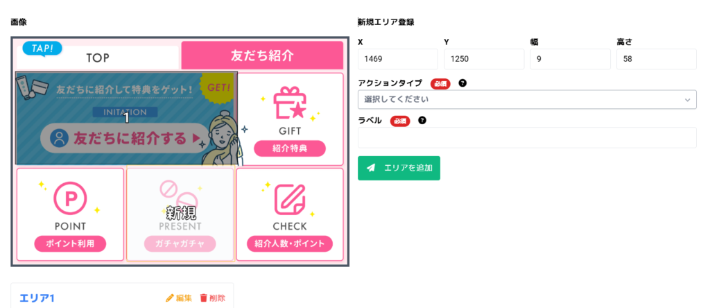 画像のように、リッチメニュー画像を読み込めば、それぞれのエリアのアクションを設定して作成可能です。