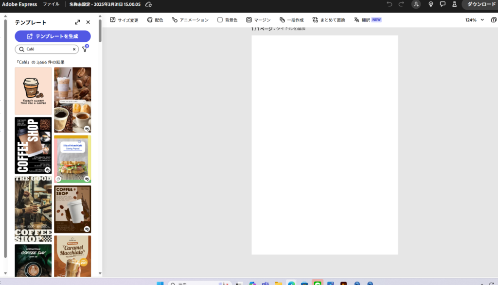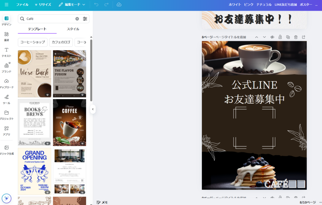 Canvaにログイン後、『Café』『居酒屋』『病院』などのキーワードで検索を行い好きなテンプレートを選びます。