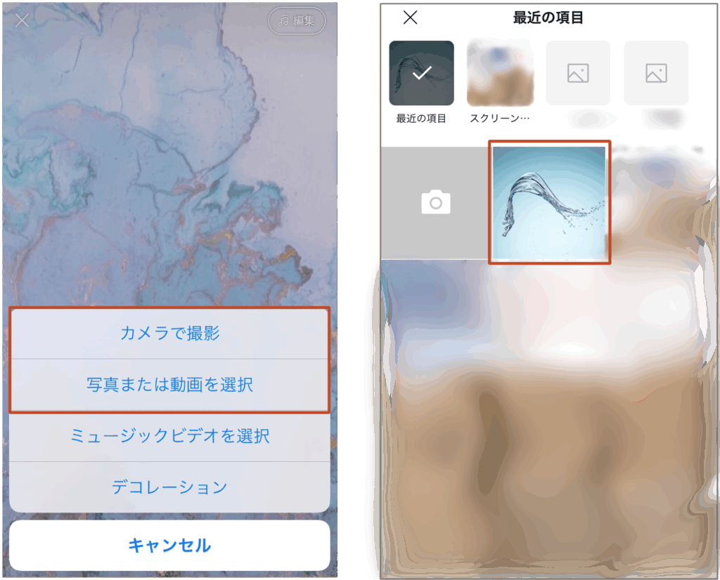 カメラで撮影』か『写真または動画を選択』を選び、設定したい画像または動画を選択します。