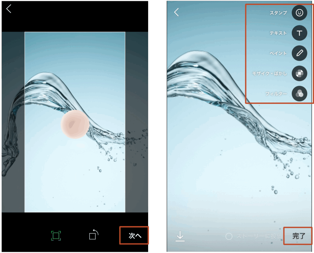 画像のサイズや位置を合わせて次へ』をタップし、スタンプテキストフィルターなどお好みで画像に編集をして『完了』