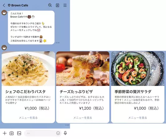 画像やカードタイプメッセージ(複数の情報を横並びのカルーセル形式で配信することができる機能)を使うことで、目を引く配信に。
